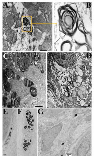 Secretory epithelium and fibroblasts of the gastric mucosa before and after ERT. (A,B) Secretory epithelial cell containing a glycolipid body (A) and with its detail at higher magnification. (C) Massive accumulation of glycolipid bodies. (D) Low-power micrographs. After ERT glycolipid bodies are absent. (E,F) Glycolipid bodies are visible in the cytoplasm of two fibroblasts. (G) Low magnification of the subepithelial region of the gastric mucosa. Glycolipid bodies are absent.