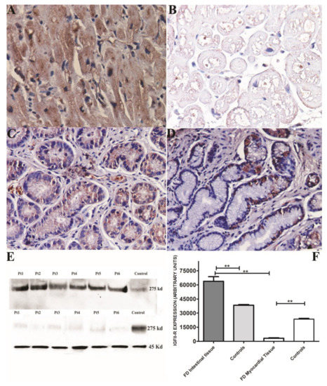 Assessment of IHC and Western blot quantification of IGF-II-R in the endomyocardial and intestinal biopsies in Fabry disease patients. (A–D) Ihc for IGF-II-R showing expression of the mannose-6-phosphate receptor in normal heart (A) compared with FD myocardial tissue (B) and in control intestinal tissue versus FD intestine. They show a remarkable reduction of myocardial receptors compared with intestinal ones and normal controls. (E) Graph showing expression of IGF-II-R in intestinal, myocardial tissue and normal control. In FD, heart expression was 19-fold lower than in FD intestine (p < 0.001). (F) Western blot of IGF-II-R in intestine and myocardium of FD patients and controls. Alpha sarcomeric actin (45 kDa) was used as the loading control. **: statistical significance value= p < 0.01.