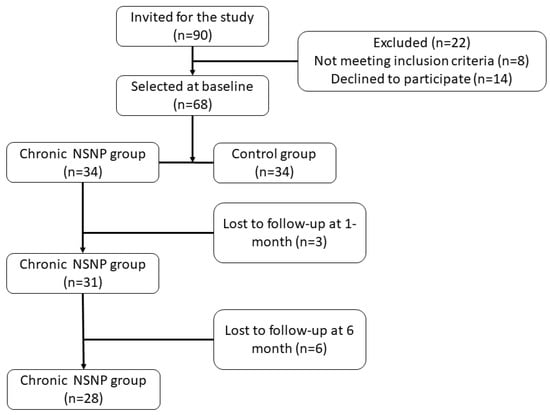 A total of 68 individuals participated in the study, resulting in 34 individuals in the chronic NSNP and healthy control groups, as shown in Figure 1. Demographics for each group were similar (p > 0.05) as listed in Table 1. Nine individuals from the chronic NSNP group dropped-out in the follow-up (three at one month and six at six months).