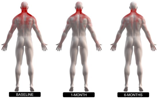 Superimposed body diagrams of pain extent and pain distribution of individuals with chronic nonspecific neck pain (NSNP) at baseline, 1 and 6-month follow-ups.