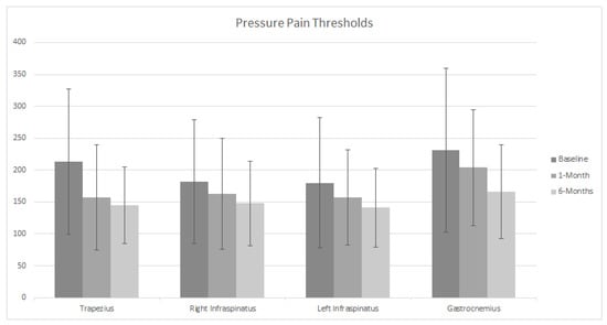 Pressure pain threshold (PPT) at baseline (n = 34), 1-month (n = 34) and 6-month (n = 34) in individuals with chronic nonspecific neck pain (NSNP) undergoing a 1-month conventional physiotherapy treatment. Data are presented for Trapezius, right Infraspinatus, left Infraspinatus and Gastrocnemius muscles in individuals with chronic NSNP. Data are presented as mean ± standard deviation.