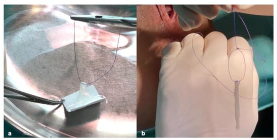 It was subsequently washed twice in saline solution at 25 °C; finally, one side of the square hAM was transfixed with a resorbable suture (3-0 Vicryl™, Ethicon Endo-Surgery, Inc., Cincinnati, OH, USA), thus creating an implantable fusiform patch (Figure 4). Attention was paid to place the epithelial side of the hAM outward, to face the lumen of the fistula tract.