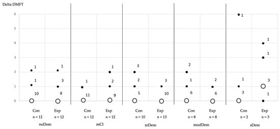 Changes in the DMFT index over time (final minus baseline), shown as ΔDMFT, separated by the mini mental state examination (MMSE) group and subgroup (control and experimental group). The legends at the points indicate the number of subjects with the corresponding ΔDMFT value. (Con: control group; Exp: experimental group) (MMSE groups—noDem: no dementia; mCI: mild cognitive impairment; mDem: mild dementia; modDem: moderate dementia; sDem: severe dementia) (hollow circles correspond to the majority of counts of changes in each evaluation group, filled circles demonstrate minor amount of counts of changes in each evaluation group, numbers at hollow and filled circle correspond to number of changes).