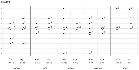 Changes in the DFT index over time (final minus baseline), shown as ΔDFT, separated by mini mental state examination (MMSE) group and subgroup (control and experimental group). The legends at the points indicate the number of subjects with the corresponding ΔDFT value. (Con: control group; Exp: experimental group) (MMSE groups—noDem: no dementia; mCI: mild cognitive impairment; mDem: mild dementia; modDem: moderate dementia; sDem: severe dementia) (hollow circles correspond to the majority of counts of changes in each evaluation group, filled circles demonstrate minor amount of counts of changes in each evaluation group, numbers at hollow and filled circle correspond to number of changes).