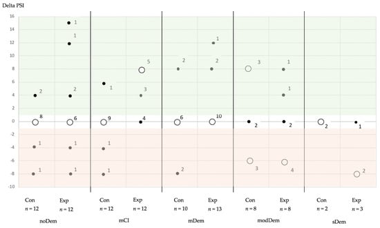 Changes in the periodontal screening index (PSI—code 0: healthy; code 1/2: gingivitis/calculus present; code 3: moderate periodontitis; code 4: severe periodontitis) over time separated by mini mental state examination (MMSE) group and subgroup (Con: control group; Exp: experimental group) after calculation of the quadratic weighted PSI code for baseline and final (ΔPSI = baseline minus final) (color coding—red: deterioration over time; white: no change; green: improvement) (MMSE groups—noDem: no dementia; mCI: mild cognitive impairment; mDem: mild dementia; modDem: moderate dementia; sDem: severe dementia) (hollow circles correspond to the majority of counts of changes in each evaluation group, filled circles demonstrate minor amount of counts of changes in each evaluation group, numbers at hollow and filled circle correspond to number of changes).