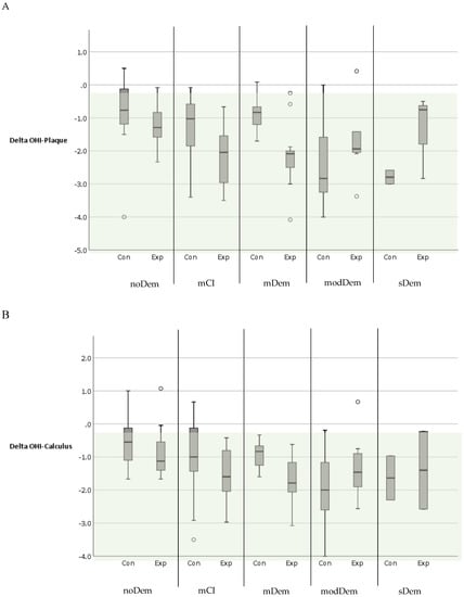 Changes in the oral hygiene index (OHI) and its components (DI: debris index; CI: calculus index) over time as: (A) ΔOHI Plaque; (B) ΔOHI Calculus; and (C) ΔOHI Score separated by mini mental state examination (MMSE) group and subgroup (control/experimental group) (Con: control group; Exp: experimental group) (MMSE group—noDem: no dementia; mCI: mild cognitive impairment; mDem: mild dementia; modDem: moderate dementia; sDem: severe dementia) (color coding—green: improvement in score; circle correspond to statistical outliers).