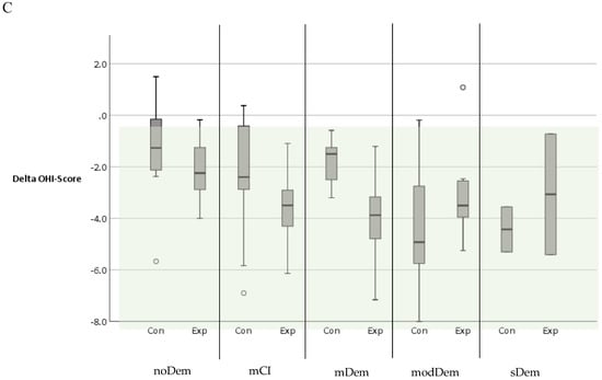 In the majority of subjects, regardless of their MMSE group or membership in the control or experimental group, an improvement was observed in the OHI score (Δ OHI Score) and in the individual OHI components DI (Δ OHI Plaque) and CI (Δ OHI Calculus). In the MMSE groups with noDem, mCI, and mDem, subjects in the experimental groups showed a stronger improvement in Δ OHI Plaque, Δ OHI Calculus, and Δ OHI Score than subjects in the corresponding control groups. For subjects in the MMSE group with modDem and sDem, this difference was not observed (Table 4, Figure 5A–C).