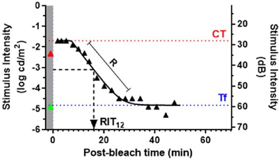 Some of the recent DA instruments, such as AdaptDx (Maculogix, Harrisburg, PA, USA), produce DA measurement defined as the rod-intercept time (RIT), which is the time required for the rod sensitivity to recover by 3 log units. This outcome measure was determined to be effective in reliably and reproducibly quantifying the rod response, which is typically the focus of clinical DA measurement applications [31]. RIT as a parameter is very effective in understanding the kinetics of the DA process and a larger value of RIT indicates delays in DA corresponding to impairments due to the underlying conditions.