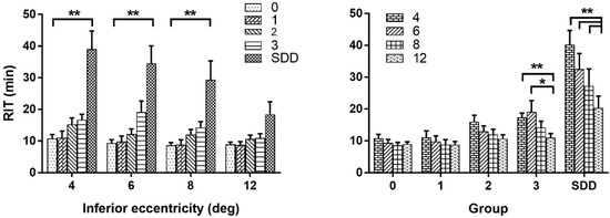 Dark adaptation in different AMD disease stages and on various retinal locations in the inferior retina in the vertical meridian. Reproduced with permission from Flynn et al. [54]. The left figure shows mean rod intercept time (RIT) for different eccentricities, showing that alterations are more pronounced in the 4°, 6° and 8° compared to the more eccentric 12° locations. (Post hoc comparisons to group 0 by eccentricity: ** p < 0.0001) The right figure compares different disease stages at certain retinal locations exhibiting markedly increased RIT values in presence of SDD. (Post hoc comparisons of RIT at 4°, 6° and 8° relative to 12° by group; * p < 0.0015, ** p < 0.0001).