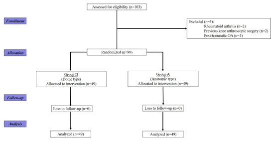 This prospective comparative study was ethically approved by the institutional review board of our hospital before gathering the patient data. Informed consent was obtained from all patients for study enrollment. From March 2019 to January 2021, 103 knees that underwent unilateral primary TKA with patellar resurfacing using a medialized dome type or an anatomic type were screened. Indications for patellar resurfacing were as follows: patients with progressed patellofemoral osteoarthritis (OA) according to the Iwano classification system (stage III–IV) [11], with a resultant thickness greater than 12 mm after patellar resection, considering the native patellar thickness [12]. We enrolled patients with a 12-month follow-up after the index operation for the study. We excluded five knees for the following reasons: rheumatoid arthritis in two, previous arthroscopic surgery around the knee in two, and post-traumatic OA in one. Finally, 98 knees fully meeting the inclusion criteria were randomly assigned either to the group with a medialized dome type (group D, 49 knees) or to the group with an anatomic type (group A, 49 knees). All patients completed the 12-month follow-up (Figure 1).