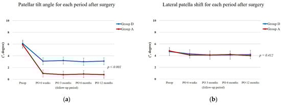 Radiographic outcomes for each period after surgery. (a) Patellar tilt angle. (b) Lateral patella shift. Postoperative patellar tilt angle was significantly improved in group A compared with group D. (An independent sample t-test was used to assess the differences in clinical and radiographic variables between the two groups. p value < 0.05 was considered statistically significant).