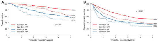 After PSM, the OS and RFS rates of patients with tumours smaller than 5 cm in the AR group were significantly better than those in the NAR group. For tumours equal to or larger than 5 cm, there was no significant difference in the OS and RFS between the AR and NAR groups.