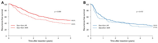 In patients with HCC smaller than 5 cm, the 1-, 3-, and 5-year RFS rates of the NAR group were 70.9%, 49.6%, and 36.8%, respectively, whereas those in the AR group were 85.3%, 58.0%, and 48.2%, respectively. In contrast, in patients with HCCs equal to or greater than 5 cm, the 1-, 3-, and 5-year RFS rates of the NAR group were 52.9%, 37.3%, and 27.5%, respectively, whereas those in the AR group were 58.8%, 39.2%, and 30.4%, respectively.