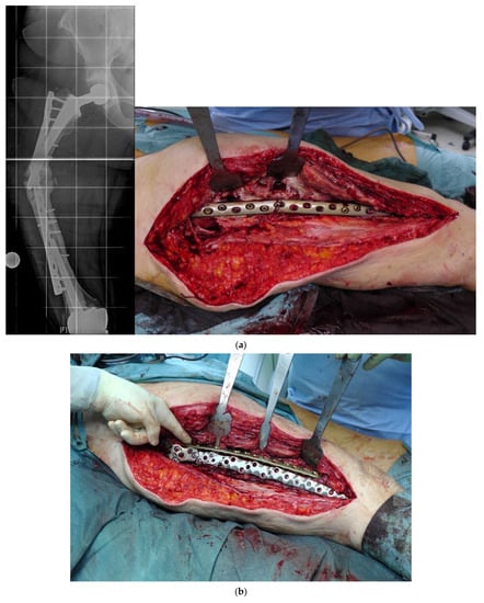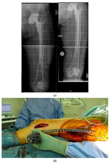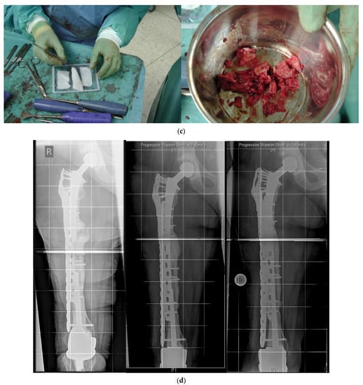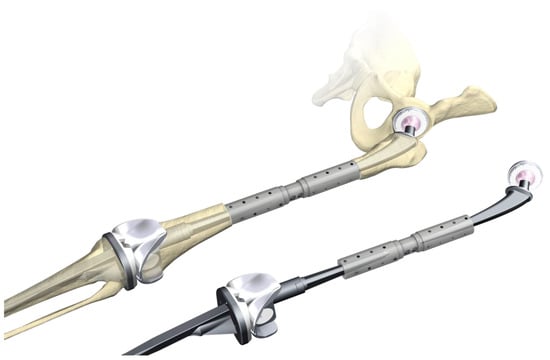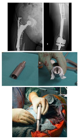 - Friedrich, M.J.; Schmolders, J.; Lob, G.; Randau, T.M.; Gravius, S.; Wirtz, D.C.; Pennekamp, P.H. Interkalare Rekonstruktion diaphysärer Knochendefekte mit einem modularen Diapyhsenersatzsystem: Klinische Ergebnisse. Oper. Orthop. Traumatol. 2015, 27, 455–462. [Google Scholar] [CrossRef] [PubMed]