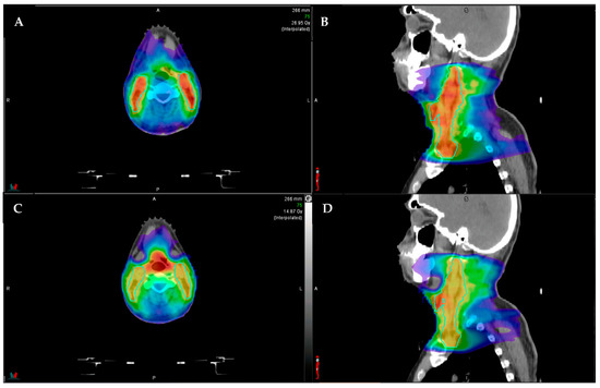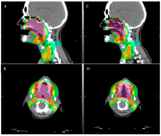 Example comparison between step-and-shoot intensity modulated radiotherapy (IMRT; (A) axial, (B) sagittal) and volumetric modulated arc therapy (VMAT; (C) axial, (D) sagittal). The color shading represents the radiotherapy dose distribution, with the red representing areas of highest dose. The aqua outlined structures represent the elective lymph node coverage. Note that the VMAT plan (C,D) has better sparing of the submandibular salivary glands (anterolateral structures), and the IMRT plan has higher hotspots ((A,B), more red color in the outlined lymph node volume).