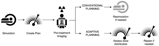 Example workflow of conventional versus adaptive radiotherapy planning. In conventional planning, patients undergo simulation, with creation of a radiotherapy plan that is delivered with standard pre-treatment imaging. If anatomic shifts are noted on pre-treatment imaging, resimulation is performed with replanning. In adaptive planning, patients similarly undergo simulation with radiotherapy plan creation; however, the additional benefit of assessment of dose distribution on pre-treatment imaging allows for better assessment of whether changes in planning are needed, allowing for either on-line (at machine) or off-line replanning.