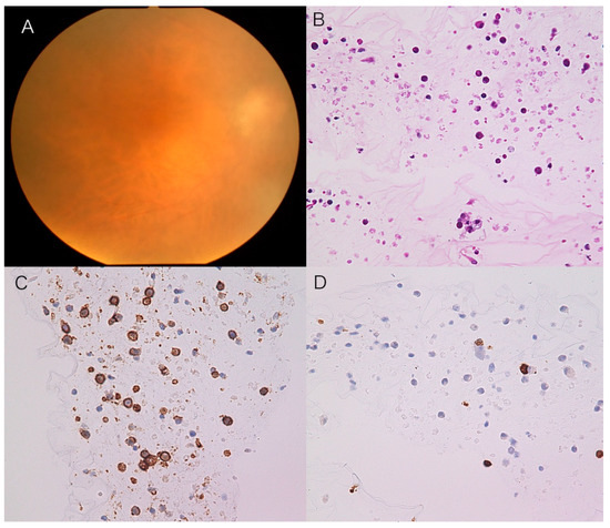 - Kase, S.; Namba, K.; Kanno-Okada, H.; Onozawa, M.; Hidaka, D.; Iwata, D.; Mizuuchi, K.; Fukuhara, T.; Fukuhara, J.; Kitaichi, N.; et al. Immunohistochemical and Immunocytochemical Analyses in Patients with Vitreoretinal Lymphoma. Ocul. Immunol. Inflamm. 2020, 28, 147–155. [Google Scholar] [CrossRef] [PubMed]