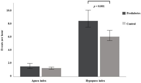 When the sleep breathing was assessed, participants with prediabetes displayed a significantly higher AHI (12.7 (6.1;24.3) vs. 9.5 (4.2;19.6) events/h, p < 0.001) than controls (Table 2). The hypopnea index was also greater among participants with prediabetes (8.4 (4.0;14.9) vs. 6.0 (2.7;12.6) events/h, p < 0.001), without differences in the apnea index (Figure 1). Altogether, the prevalence of OSA was higher among participants with prediabetes than in controls (78.1 vs. 69.9%, p = 0.007). Additionally, patients with prediabetes presented a higher CT90 and ODI4%, as well as lower median and minimum SpO2 levels (p ≤ 0.001 for all) than patients without prediabetes. No difference in the daytime sleepiness was observed between groups.