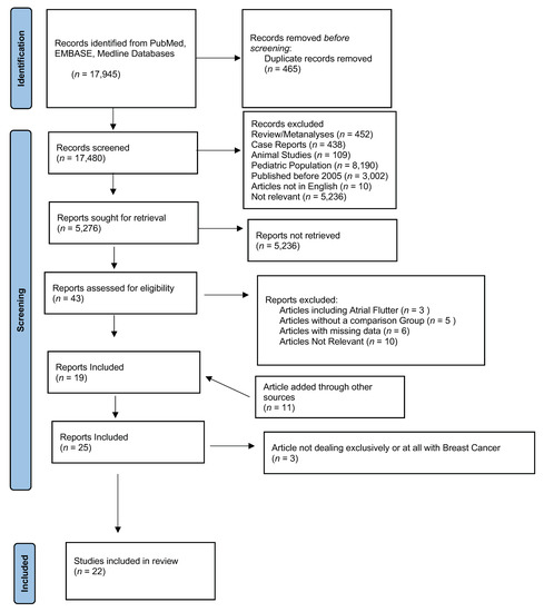 We searched PubMed, Medline, EMBASE databases. The search strategy included the following search terms: “atrial fibrillation” AND cancer, (“atrial fibrillation” AND “breast cancer”) AND (chemotherapy [MeSH Terms]), “breast cancer” AND “cardiac toxicity *,” (cancer OR “malignant neoplasm” OR neoplasm OR tumor) AND “atrial fibrillation” OR AF; (“breast cancer” OR “breast carcinoma” OR “mammary cancer”) AND “atrial fibrillation,”.