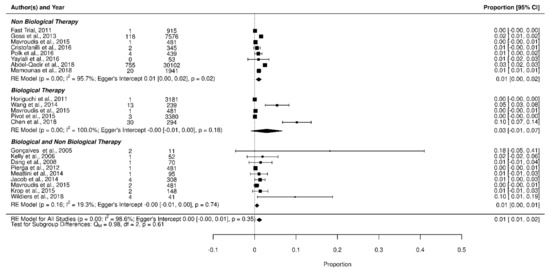 We found no statistically significant difference in the occurrence of AF in BC patients undergoing biological therapy, non-biological therapy, or their association; as shown in Figure 3, non-biological therapies had a cumulative AF incidence of 1% [95% CI: 0%, 2%], with 2.1% of patients developing AF while biological treatment showed a cumulative AF incidence of 3% [95% CI: −1%, 7%], with 0.6% of patients developing AF. For biological therapy associated with non-biological treatment, we reported a cumulative AF incidence of 1% [95% CI: 1%, 2%], with 1.1% of patients developing AF. The test for sub-group differences was not significant (p = 0.61).