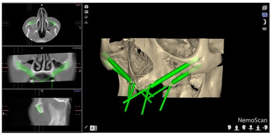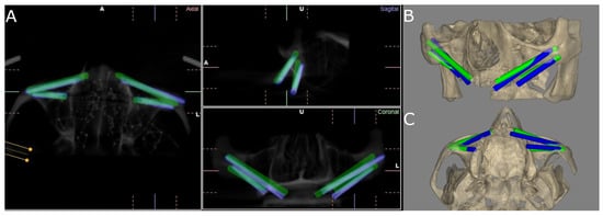 Following placement of the ZIs, the researchers conducted postoperative CBCT scans (WhiteFox, Satelec, Merignac, France) using the aforementioned exposure parameters. The planning and postoperative CBCT scans (WhiteFox, Satelec, Merignac, France) of the different study groups were subsequently imported into 3D implant-planning software (NemoScan, Nemotec, Madrid, Spain). The scans were then overlaid in order to assess the apical deviation, measured at the coronal entry point (mm), apical end point (mm), and angular deviation (°), with the latter measured at the center of the cylinder. Any deviations that were noted in any of the implants were subsequently analyzed and compared between the axial, sagittal, and coronal views (Figure 4A–C) by an independent operator. In addition, deviations in the positions of the zygomatic dental implants were also recorded and analyzed.