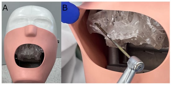 A preoperative CBCT scan was taken of the NI anatomically based standardized polyurethane models (WhiteFox, Satelec, Merignac, France) prior to placing a jaw tag; the use of polyurethane was based on the American Society for Testing and Materials’ (ASTM F-1839-08) approval of the use of polyurethane for testing instruments and dental implants (“Standard Specification for Rigid Polyurethane Foam for Use as a Standard Material for Test Orthopedic Devices for Instruments”) []. This black-and-white tag was affixed to the dental surface of the anatomically based, standardized polyurethane models using a photopolymerized composite resin (Navistent, ClaroNav, Toronto, ON, Canada). The datasets obtained from the CBCT scan were uploaded to treatment-planning software (Navident, ClaroNav, Toronto, ON, Canada) on a laptop computer mounted onto a mobile unit to simulate placement of the ZIs in accordance with the prior surgical planning (Figure 3A). An additional black-and-white drill tag was affixed to the handpiece (W & H, Bürmoos, Austria). The researchers calibrated and identified both of the optical reference markers with an optical triangulation tracking system using stereoscopic motion-tracking cameras, orienting the drilling process in real time to ensure that the planned angle, pathway, and depth were achieved. A ZI system (Galimplant, Sarria, Lugo, Spain) was used to perform the drilling, with this procedure being monitored using the computer-aided dynamic navigation system installed onto the laptop computer (Figure 3B).