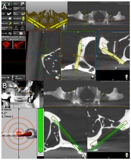 (A) Preoperative planning of placement of ZIs with the dynamic navigation appliance using treatment-planning software, and (B) tracking procedure during ZI placement.