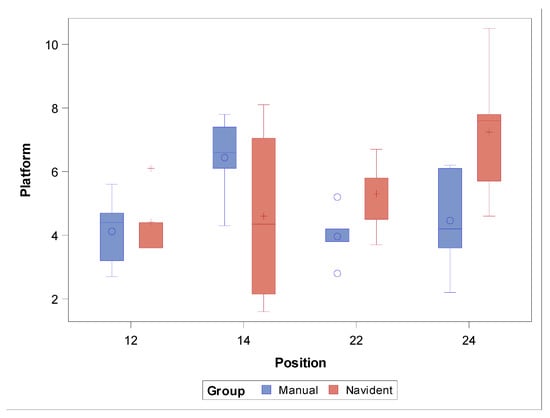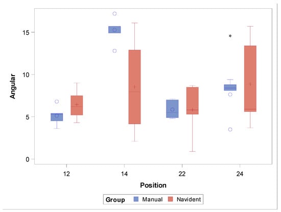 The paired Student’s t-test found no statistically significant differences between the angular deviations of the study groups (p = 0.3132); on the other hand, statistically significant differences were shown for the zygomatic dental implant positions (p = 0.0008), especially at the ZI position 1.4 (p = 0.0040) (Figure 7).