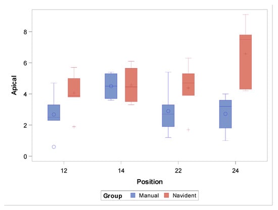 Box plot of apical end-point deviations recorded in the study groups and ZI positions. Median values are represented by the horizontal lines within each box. The symbols represent extreme values.
