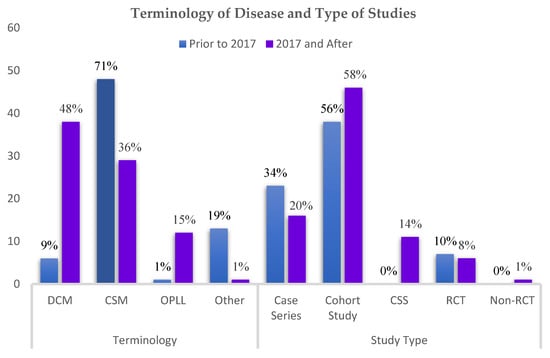 Terminology of Disease and Type of Study prior to 2017 (n = 68) compared to 2017 and after (n = 80). Abbreviations: DCM: Degenerative Cervical Myelopathy; CSM: Cervical Spondylotic Myelopathy; OPLL: Ossification of Posterior Longitudinal Ligament; CSS: Cross-Sectional Study; RCT: Randomized Controlled Trial.