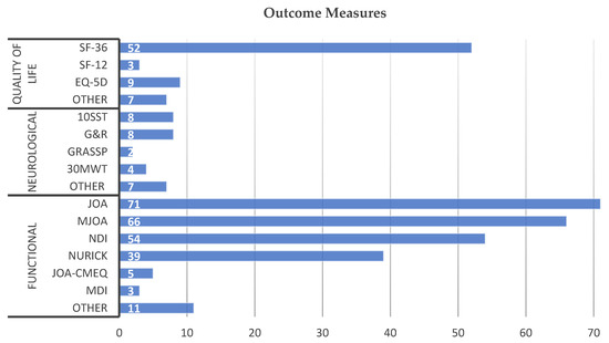 Functional outcome measures were the most common type of instrument employed, with all studies employing at least one of these measures and an average of 1.68 measures per study. The most frequently used functional assessments were JOA (71), mJOA (66), the Neck Disability Index (NDI) (54), and the Nurick grade (39) (Figure 4, Table 2). A total of 11 other measures were used including JOA-CMEQ, the Myelopathy Disability Index (MDI) (3), the Geriatric Locomotive Function Scale (GLFS-5), overactive bladder symptom score (OBSS), and the Cooper scale.