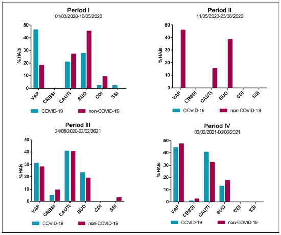 A total of 54 HAIs were recorded in period I, 26 in period II, 135 in period III, and 146 in period IV. They occurred mainly in COVID-19 patients in periods I, III, and IV (N = 43, N = 103 and N = 106, respectively), whereas non-COVID-19 patients were only affected during period II. As for the HAI type, during period I, the COVID-19 cohort had a high incidence of VAP (46.6%), whereas a high number of BUO were diagnosed among non-COVID-19 patients (45.5%) (Figure 2). In period II, most infections were VAP and BUO (46.2% and 38.5%, respectively). In the last two periods, the type of HAI was similar in both cohorts, with a high incidence of CAUTI in period III (40.8% vs. 40.6%) and VAP in period IV (44.3% vs. 47.5%). Lastly, infections sustained by Clostridium difficile and SSIs were rarely diagnosed and almost only in period I in both cohorts.
