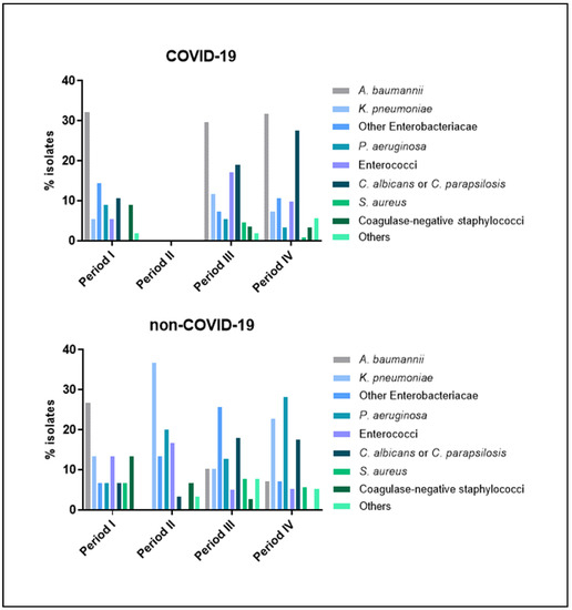 Among COVID-19 patients, HAIs were mostly caused by Acinetobacter baumannii in all periods (around 30% each), followed by other Enterobacteriaceae in period I and Candida albicans or C. parapsilosis in periods III and IV, respectively (Figure 3). By contrast, among non-COVID-19 patients, A. baumannii was primarily responsible for HAIs during period I only (26.7%), whereas Klebsiella pneumoniae and Pseudomonas aeruginosa were the most frequently isolated pathogens during period II (26.7% and 20.0%, respectively) and period IV (22.8% and 28.1%, respectively) and other Enterobacteriaceae and C. albicans or C. parapsilosis in period III (25.6% and 18.0%, respectively). Staphylococcus aureus, coagulase-negative staphylococci, and the other microorganisms were less frequently detected in both cohorts.
