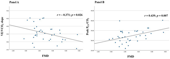 In the overall study population, FMD values showed a significant Pearson’s correlation with two primary CPET parameters, namely VE/VCO2 slope (r = −0.371, p = 0.026, Figure 1A) and PETCO2 at peak (r = 0.439, p = 0.007, Figure 1B), while no significant correlation was observed with other CPET variables both in parametric and in non-parametric tests. In multiple linear regressions, after adjusting for gender, age, body mass index, hypertension, dyslipidemia, diabetes, and smoking habit, FMD was the only independent predictor of VE/VCO2 slope (β = −1.308, p = 0.029) and peak PETCO2 values (β = 0.779, p = 0.021). Finally, when stratifying our study population based on their ventilatory efficiency [16], fifteen patients with a ventilatory class III-IV (VE/VCO2 slope ≥ 36) exhibited significantly lower FMD values as compared to those (n = 21) with a ventilatory class I-II (2.18% ± 1.29 vs. 3.40% ± 2.26, p = 0.048).