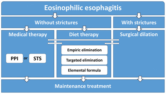 According to current recommendations, first-line treatment should be chosen between medical therapies, such as proton pump inhibitor or STS application, or dietary interventions, such as empiric elimination, elemental formula or targeted elimination [,]. In the event that clinically relevant strictures are present at the point of diagnosis, esophageal dilation may also be considered (Figure 1).