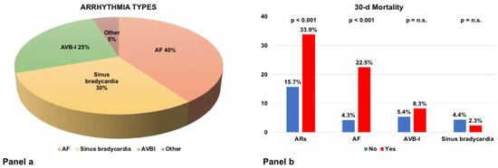 Panel (a): types of arrhythmias. Panel (b): 30-day mortality across ARs types.