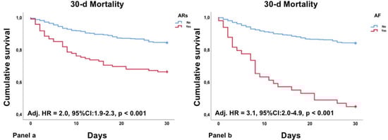KM curves describing 30-day mortality for ARs (Panel (a)) and AF (Panel (b)).