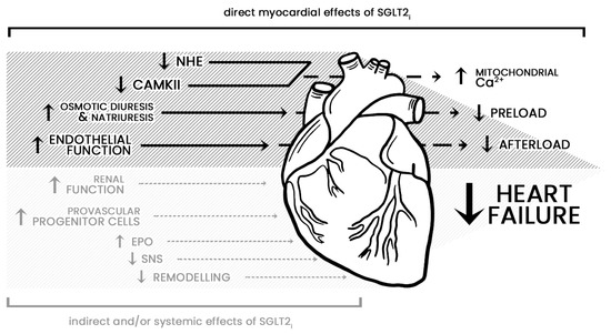 SGLT2i promote osmotic diuresis and natriuresis and therefore may reduce the preload [23,24,25]. Furthermore, gliflozin’s pleiotropic vascular effects result in vasodilation and reduction in the afterload [26,27,28,29]. Improvement of endovascular function due to indirect attenuation of oxidative stress and direct inhibition of pro-inflammatory mediators is also a major benefit [30]. Other studies have found that SGLT2i enhance myocardial metabolism, inhibit the sodium-hydrogen exchanger 1 isoform in the myocardium, and reduce calmodulin-dependent kinase II activity, which increases mitochondrial calcium levels and improves cardiac efficiency [31,32,33]. Potential beneficial outcomes of SGLT2i also include improvement of renal function, reduction in adipose tissue-mediated inflammation and sympathetic overdrive, modulation of the intrarenal renin–angiotensin system, as well as increase in erythropoietin levels and upregulation of provascular progenitor cells [34,35,36,37,38,39]. The protective effects of gliflozin on other organs are especially important, as the natural history of HF leads to their progressive involvement and dysfunction. Myocardial and systemic effects of SGLT2i are presented in Figure 2.