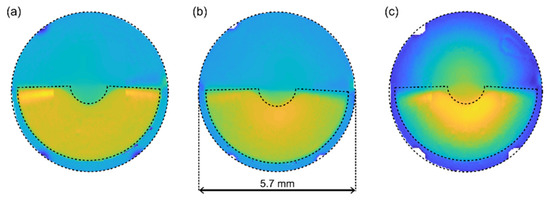 The relative phase profiles of the different lens base powers are shown in Figure 1. These images were obtained with a commercial NIMO TR1504 instrument (Lambda-X, Nivelles, Belgium). The far and near refractive zones can be clearly appreciated in blue and yellow, respectively. These measures are only qualitative and intended to show the zonal power distribution variation of the lens design.