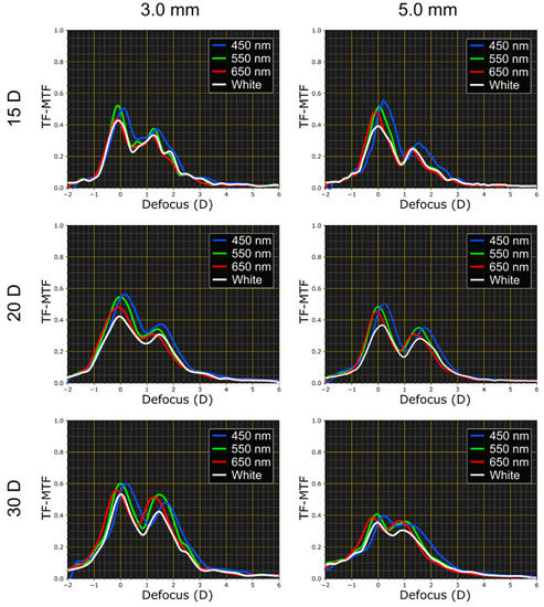 The LCA was obtained from the corresponding TF-MTF curves as the difference, in diopters, between the blue (450 nm) and the red (650 nm) focal planes. The results are shown in Table 1. The experimental error in each measurement of LCA is ±0.11 D.