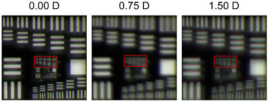 Experimental polychromatic USAF test images, at different vergences, obtained for a 30 D power lens with 3.0 mm pupil diameter.