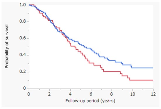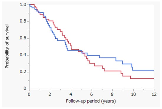 Figure 1 depicts the results of the Kaplan–Meier analysis; OS was assessed with the log-rank test in the PRFA with and without CL cohorts. The median survival time (MST) was 4.5 years in the PRFA with CL cohort (red line; n = 76) and 5.4 years in the PRFA without CL cohort (blue line; n = 145) (p = 0.0806). OS did not differ significantly between the PRFA with and without CL cohorts.