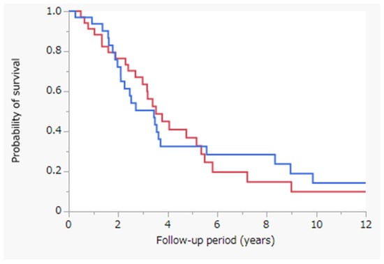 Figure 2 depicts the results of the Kaplan–Meier analysis; OS was assessed with the log-rank test between the PRFA with and without CL cohorts after propensity-score-matched analysis. MST was 4.0 years in the PRFA with CL cohort (red line; n = 54) and 3.6 years in the PRFA without CL cohort (blue line; n = 54) (p = 0.5474). After propensity-score-matched analysis, OS was not significantly different between the PRFA with and without CL cohorts.