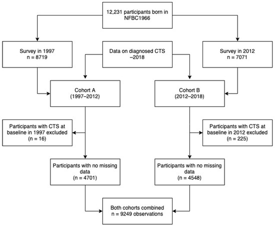In 1997, at the age of 31, a total of 8719 participants gave their informed consent to voluntarily participate in the study, underwent a clinical examination, and answered several questionnaires. Of this study population, 16 participants were already diagnosed with CTS and were excluded from the analysis. Of the 8703 participants, 4701 with no missing data were included in the study.