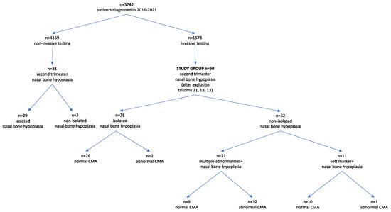 In total, 5742 women were examined in the analyzed period and 1573 invasive tests were performed. All cases of trisomy 21, 18 and 13 were excluded from further analysis. A total of 203 cases were excluded (138 cases of trisomy 21, 49 cases of trisomy 18 and 16 cases of trisomy 13). After exclusion of trisomy 21, 18 and 13, 60 cases with nasal bone hypoplasia were analyzed. Our study group consisted of 28 cases of isolated nasal bone hypoplasia, 11 cases of nasal bone hypoplasia with soft markers, and 21 cases of nasal bone hypoplasia with concomitant malformations. Monozygotic twins were counted as one case. Invasive diagnosis was not performed in 31 cases of nasal bone hypoplasia. This was due to the lack of consent to invasive diagnostics. These were mostly cases of isolated nasal bone hypoplasia. Two cases had additional abnormalities, after delivery, both children were diagnosed with trisomy 21. Follow up from 29 cases with isolated nasal bone hypoplasia without invasive diagnosis was not collected. Figure 1 shows the patient flowchart.