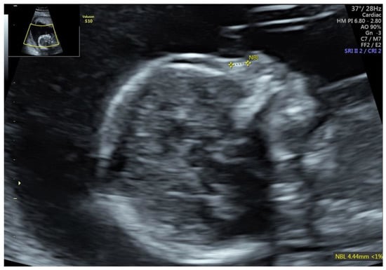 - Singh, C.; Thakur, S.; Arora, N.; Khurana, D. Revisiting absent nasal bone in the second trimester. J. Clin. Ultrasound 2021, 49, 3–7. [Google Scholar] [CrossRef] [PubMed]