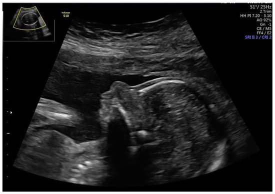 A higher rate of abnormal genetic test results is observed in cases with nasal bone hypoplasia, combined with congenital malformations [12]. In our study, many rare chromosomal aberrations, such as Pallister–Killian syndrome, were observed, as well as partial monosomy of chromosome 13, isochromosome 9p or complex chromosomal aberration with Cri-du-chat syndrome were also noted. In almost all of the chromosomal aberrations detected in our study, facial dysmorphia, such as a flat profile or a small nose, is described either prenatally or postnatally. Gu et al. described rare chromosomal aberrations in cases with nasal bone hypoplasia and congenital malformations, such as Cri-du-chat syndrome (del 5p15.33p14.3 and dup 5q35.3), Smith–Magenis syndrome (del 17p11.2), duplication 17q23.3q25.3 (rare pathogenic CNV) and deletion 9q31.2 (CNV of potential significance) [10]. Nasal bone hypoplasia has already been described several times in fetuses with Cri-du-chat syndrome; in fact, in the second trimester, nasal bone hypoplasia may be the only symptom of Cri-du-chat syndrome [3,13,14]. However, Cri-du-chat syndrome is typically characterized by more abnormalities; indeed, our case with Cri-du-chat syndrome (deletion 5p15.33p15.32 and duplication 11q22.3q25) was characterized by nasal bone hypoplasia and micrognathia, together with ventriculomegaly and abnormal posterior fossa. Nasal bone hypoplasia is often observed in syndromes with a characteristic facial dysmorphism. Liberati et al. reported Pallister–Killian syndrome with a diaphragmatic hernia and characteristic flat profile and small nose [15]. In our case with Pallister–Killian syndrome, nasal bone hypoplasia, abnormal profile, diaphragmatic hernia and ventricular septal defect were diagnosed (Figure 2).