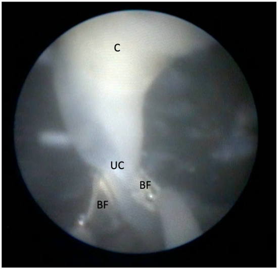 Occlusion of the umbilical cord (UC) with bipolar forceps (BF) at multiple levels. The level of the preceding coagulation (C) is depicted at 12 o’clock.
