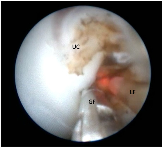 Dissection of the coagulated umbilical cord (UC) with a 3 Charr. grasping forceps (GF) and a bare laser fiber (LF).