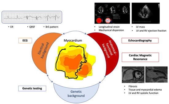 Figure summarizes the features related to increased risk of ventricular arrhythmias obtained by ECG, imaging (echocardiography and cardiac magnetic resonance) and genetic techniques. BrS: Brugada Syndrome; ER: early repolarization; LV: left ventricular; QRSf: fragmented QRS.